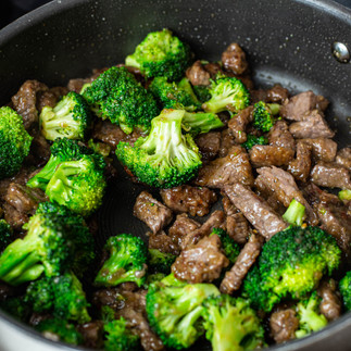 In the same pan heat up a splash of olive oil. Cook the beef mixing periodically until browned and cooked through. Add the Kung Pao sauce and 2 TBSP of water. Mix until the beef is coated through. Add the broccoli back in and mix until well combined.